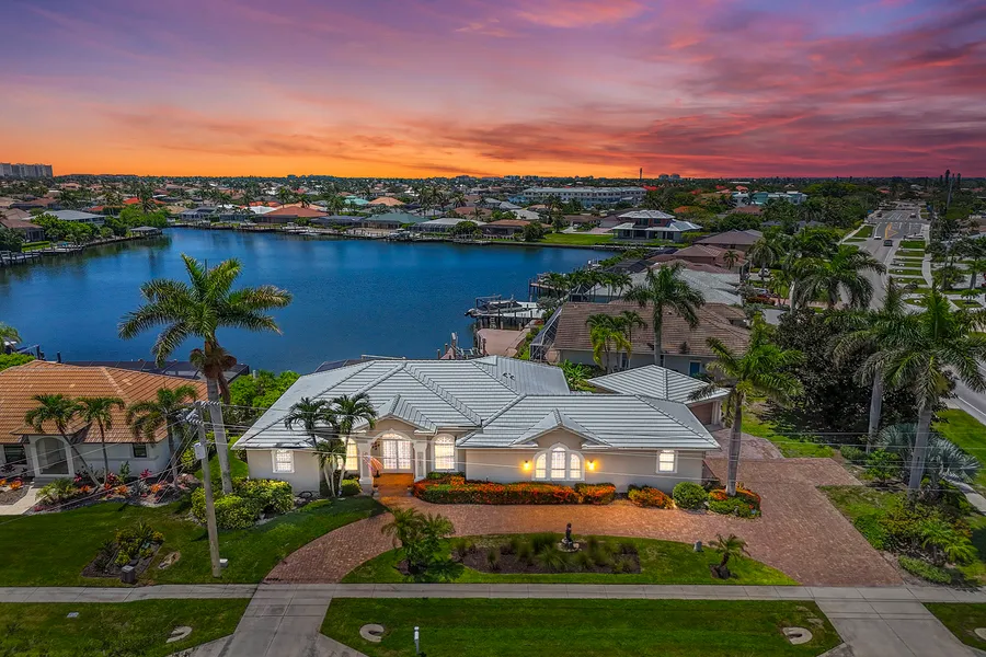 Welcome to an exceptional waterfront residence offering sweeping bay views and a seamless blend of comfort and refined living. This expansive four-bedroom, three-bath home, enhanced by a versatile den, expansive media room and with 2,716 square feet under air, sits on a generous oversized corner lot. A stately papered circular drive leads you to ample parking, including a two-car attached garage and an additional two-car detached one, offering abundant space for vehicles and storage. Upon entry through the custom-etched dolphin door, you are welcomed into a formal living area enhanced by a decorative built-in electric fireplace setting the tone for the charm that unfolds within, ideal for cozy evenings or intimate gatherings. The separate dining room is ideal for formal events, while a dedicated den/office provides built-in shelving and cabinetry for a functional workspace. The kitchen boasts gleaming granite countertops, built-in desk, an abundance of custom cabinetry, stainless steel appliances, breakfast bar, and a sunlit morning room with panoramic bay views. The adjacent wet bar, complete with a wine cooler, makes an effortless entertainment, while the family room provides a warm and welcoming space for friends and loved ones to gather. The thoughtful split-bedroom floor plan ensures privacy and convenience. The primary suite is a tranquil retreat with a luxurious en-suite bath, while a second bedroom also enjoys its own en suite. Two additional bedrooms are served by a pool bath, which can be closed off for added seclusion and is ideal for guests or family. A large, versatile media room provides endless possibilities for relaxation and recreation. Throughout the home, vinyl and tile floors complement vaulted and tray ceilings, creating an atmosphere of understated elegance. Enjoy the best outside living from the screened lanai, where you can watch dolphins play or bask in the sunshine beside the sparkling pool with a built-in barbecue and fire pit, making this ideal for alfresco dining and year-round entertainment. Waterfront amenities include a private dock and boat lift, inviting you to fully embrace the boating lifestyle. Additional highlights include electric and manual shutters for peace of mind, a new roof installed in 2020, and manicured landscaping that enhances the property's curb appeal. This residence presents a unique opportunity to enjoy extraordinary bay views and upscale waterfront living.