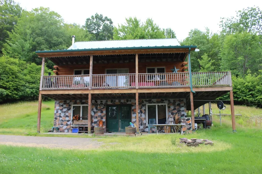 New York mostly wooded land with home and outbuildings for sale: Located in the town of Willing this 4 bedroom, 2.5 bath, log sided home sits on 95+ acres with 4000+ feet of road frontage. The home was built in 2005. While the home is mostly finished there are still some finishing touches to be completed. You enter through the walk-in basement. There you will find a T.V. room, the utility room, a full bathroom/laundry room and a kitchenette. On the main floor there are 2 bedrooms, another full bath(unfinished), a kitchen(unfinished) and a living room open to the kitchen. From the main floor there are 2 accesses that lead to the wrap around deck where there are beautiful views of the neighboring hillsides. On the second floor there are 2 more bedrooms that share a 1/2 bath. The home is heated with a high efficiency propane furnace that can be supplemented with the wood burning stove in the basement as well as the pellet stove on the main floor.