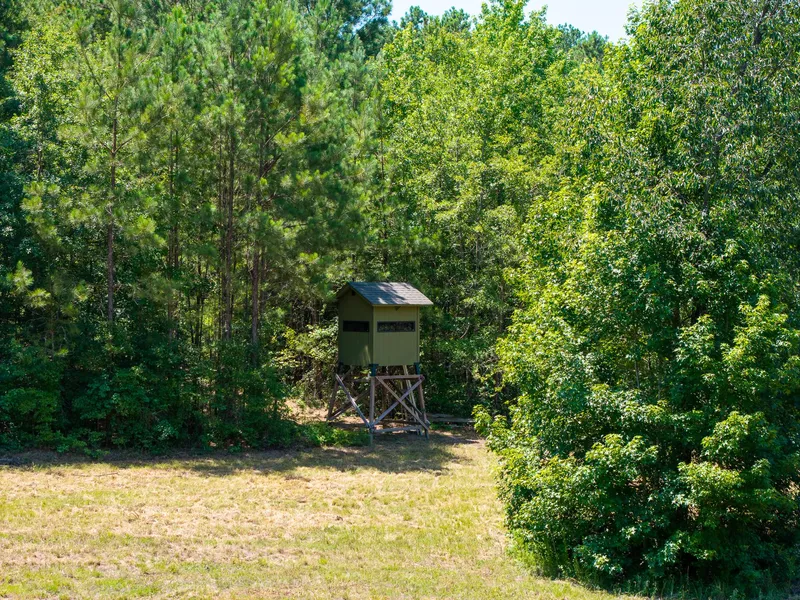 Miles of interconnected trails wind through rolling topography of upland soils that support a healthy forest of upland oaks and Longleaf pine. The diverse habitat is home to abundant wildlife, including whitetail deer and turkey. A seasonal drain, a 1-acre game patch, and mast-producing oaks further enhance the property's excellent hunting potential. Complete with a luxury, insulated box blind, covered tripod, and ground blind, it's ready for hunting season.