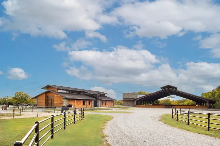 The climate controlled architecturally significant show barn mirrors the unexpected elegance with clean lines balanced against a rustic touch. Up to eight stalls with turnouts, two wash bays, rubber flooring, tack room, commercial bathroom, ...