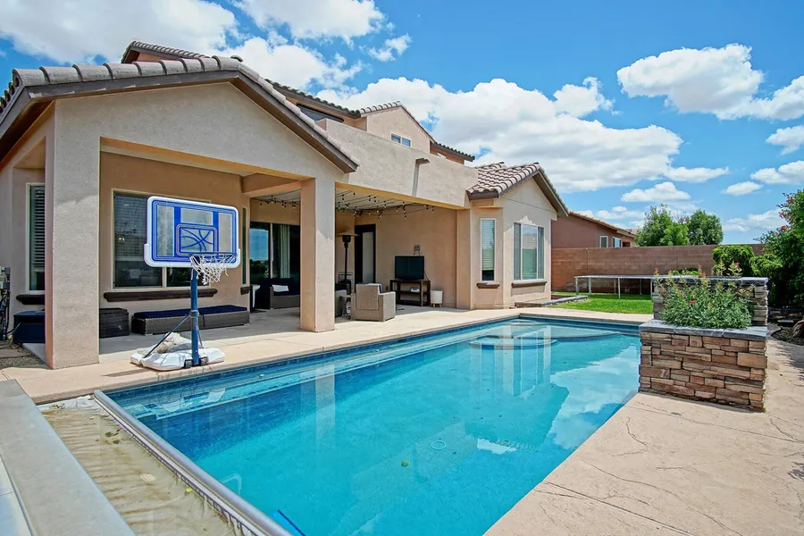 Stunning home with a pool in the exclusive gated Tres Colinas neighborhood. Backyard oasis features a heated, in-ground gunite pool w automatic safety cover, gas stub-out for grilling, professional landscaping, & spacious covered back patio with expansive 14-foot 3-paneled glass sliding door. Inside, the beautifully updated kitchen is a chef's dream, showcasing white custom cabinets that extend up to 10ft ceilings, white quartz countertops, a large center island, & butler's pantry. The office also features floor to ceiling cabinetry. 4-zone refrigerated air. Upstairs, a generous loft connects 2 bedrooms on each side. One side w a Jack and Jill bathroom. Downstairs, a casita w full bath connects to a massive additional living area. Enjoy 2-toned synthetic stucco & courtyard entrance