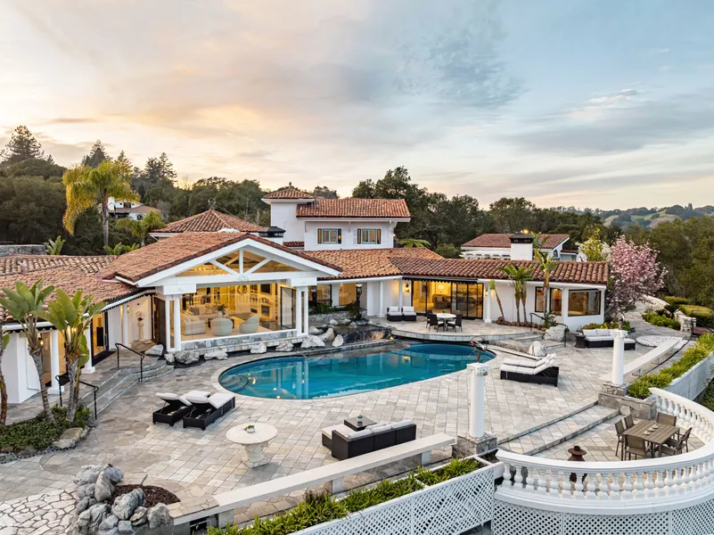 Secluded in the scenic hills of Upper Happy Valley, this Mediterranean villa is a private world of refined beauty and resort-style living. With 7,540 square feet in the main home and an additional 1,045-square-foot guest house, the property spans 3.23 acres of lush, landscaped grounds framed by sweeping views of the Lafayette hills and Mount Diablo.