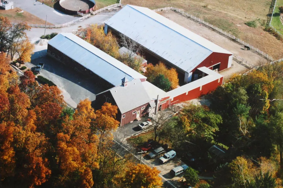 storage space. The indoor arena is a separate building accessed via an enclosed walkway and