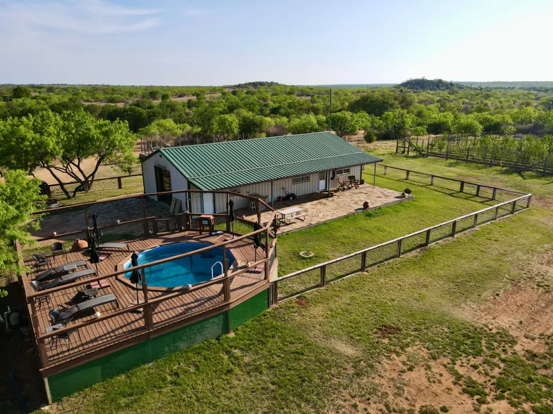 Upon entering the ranch, you are greeted by the 1,800 sqft custom finish barndominium. The barndo is located on one of the higher points of the ranch and faces north towards a wide open pasture. The home has 2 bedrooms that can sleep 6 people, 2 bathrooms, an entertainment area with a clear roll up garage door. All furniture in the home will convey. The outdoor space consists of a +2,000 sqft partially covered stone patio. Just in time for Spring and Summer, youll be able to enjoy the swimming pool and sunbathing deck. Other improvements on the ranch include: Fully high fenced along the boundary with internal cross fencing, 55 x 65 high fenced garden area with 12 raised beds plus an 85 x 150 high fenced orchard with a variety of fruit trees, irrigation to garden and orchard, a hay barn, covered shooting platform, rifle and pistol range, clay wobble trap range and livestock pens.