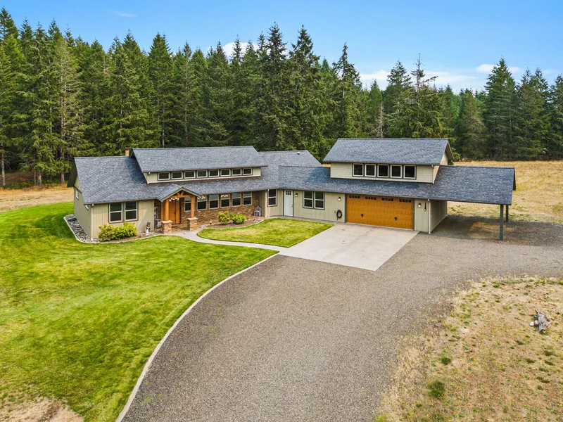 This meticulously crafted home blends elegance, comfort, and functionality. With over 3,100 SF of living space set on 12.5 private acres it offers both convenience and retreat. Enter through a dramatic 9' alder door into a lodge-style great room with soaring 17' ceilings and a 12' slider framing the scenic acreage. A custom fireplace with hand-hewn mantel adds warmth and character. The open dining area flows into a chefs kitchen featuring concrete counters, eating bar, and abundant workspace. The primary suite boasts a spa-like bath w/ custom shower, soaking tub, and walk-in closet. Upstairs there is a massive bonus/media room. Efficient geothermal heating/cooling, covered patio, yard irrigation and more. Dont miss this rare opportunity!