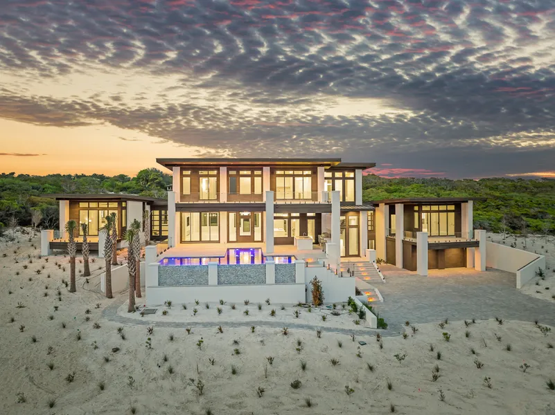 Coastal enchantment unites with progressive modern luxury at this bespoke new construction offering in the untampered community of Four Mile Village. Surrounded by the protected Coffeen Nature Preserve to the north and the Gulf of Mexico to the south, the serene neighborhood provides an idyllic locale for this prominent showcase home, situated on an elevated one-plus-acre parcel, one row off the gulf. Designed to be equally whimsical and bold, the progressive design bridged elements of mid-century design principles and married them with features designed to enhance contemporary beach living.