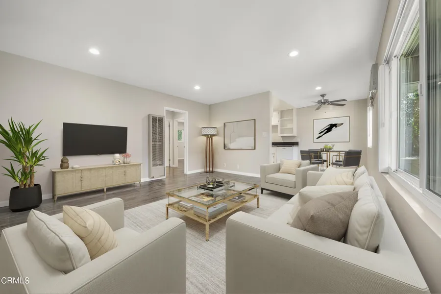 OPEN HOUSE Saturday January 17th at 1:30 PM! Remodeled Spacious Two-Bedroom Top-Floor unit with Gated Parking in Unit Laundry Hook-Ups and Large Balcony with privacy screen. This spacious home has an abundance of large newer windows that fill the home with bright natural light. A large second bedroom offers an excellent FLEXIBLE SPACE for a home office or gym! A tastefully updated kitchen features a new stove/oven, quartz countertops, new faucet, Dishwasher, microwave, and garbage disposal. Some other nice attributes of the home include a large balcony, balcony privacy shade, premium laminate flooring throughout, smooth ceilings, recessed LED lighting with dimmers, newer dual pane energy saving windows, custom blinds and updated bathroom. This lovely residence is equipped with AC, IN UNIT LAUNDRY hook-ups, USB charging outlets in the bedroom/den and is cable primed. The bathroom updates include a new medicine cabinet vanity with mirrored interior, newly installed handheld shower head, soaking bathtub, and ceiling fan/heater. The bedrooms have beautiful designer beveled mirror closet doors and a custom-organizer storage system. Included in the rent are TWO assigned Gated Parking spaces with remote-controlled entry and a large storage cabinet. An optional extra clean on-site laundry room has an easy phone pay application. This home is in close proximity to the metro/freeway, South Lake, Old Town Pasadena shopping and Chic restaurant dining. Great Pet-Friendly Community! Living room has been staged.