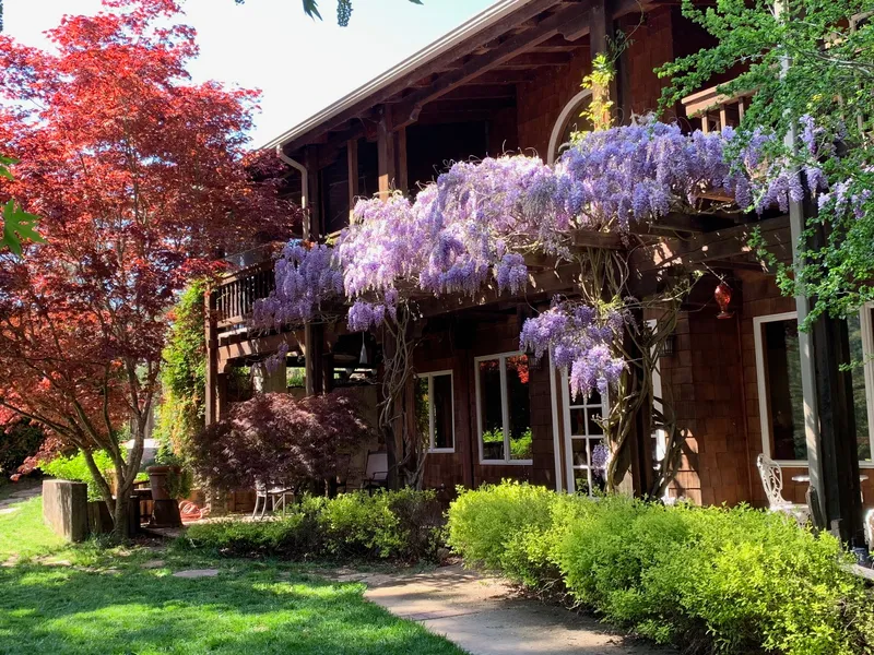 The main residence features beautiful hand-hewn timber beams inside and out and is sited at a generous elevation, offering incredible views from virtually every vantage point. An inviting wisteria-draped front porch entrance opens into the first-floor great room. The central core of this room boasts a two-story vaulted ceiling above the dining area and is flanked on one side by the living room and on the other, a kitchen, both with ceilings at a lower profile. The farmhouse-style kitchen is striking with its wraparound counter and breakfast bar, exposed beams and rafters, coffered ceiling and abundant cabinetry. The second floor hosts the primary bedroom suite, bath/laundry and family room, and includes a screened-in porch and steps that lead to a beautiful rose and vegetable garden. The detached studio visually blends into the landscape and features a spacious second bedroom and bath.
