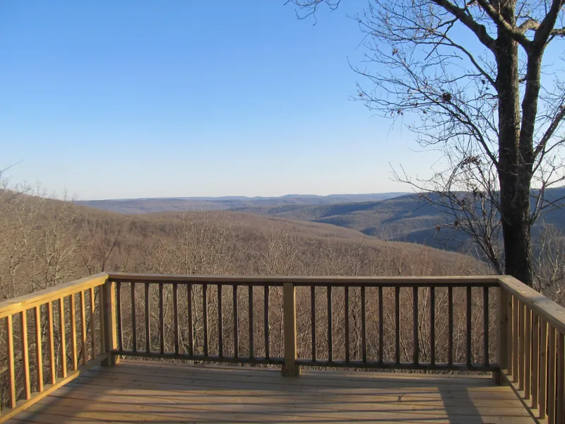 This High Mountain Oasis is nestled in the heart of the Ozark National Forest. The Lodge sits on the rim of a high Mtn overlook w/180 degree views that span 40+ miles. Lodge has approx 1860 sqft of living space 3 BR/2Ba, CH&A. Custom Built w/tongue and groove cedar and pine ceilings and walls, custom door, Vaulted Ceiling w/lighting throughout the open beam rafters, Custom Kitchen very modern w/appliances to convey, Granite Countertop, built in wine rack and spacious cabinets. Living Room area has a standing rustic gas log fireplace and is fully furnished. Bedrooms are furnished w/built in bunk beds.. Two bedrooms have queen beds. Inside utility room that also serves as a pantry. Very large multi purpose room running the length of the back of house that has large raise up doors. One that is powered by a built in electric winch that opens this room to the outside deck, at one end of the r...