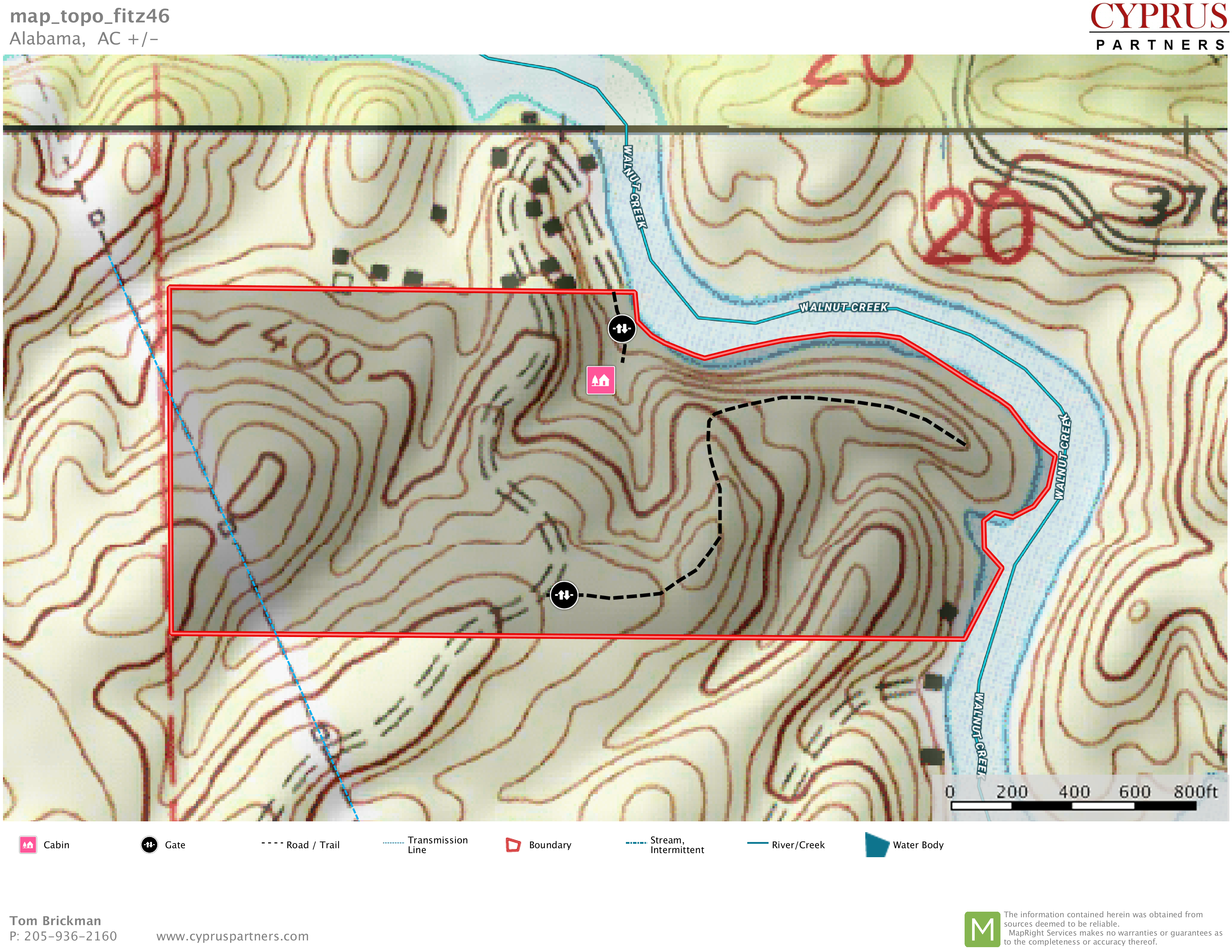 Take Chilton County Road # 28 east (toward Mitchell Lake) and go 5.6 miles. Take a left on to County Road # 465. This road is paved but turns to dirt a couple hundred yards from the turn. Go 1.7 miles to the property entrance and gate on the right. Look for the Cyprus Partners sign. The gate is locked so call the agent for access instructions. Once you pass through the gate it is about 1/3 mile on a new dirt road to the turn-around near the water. You are welcome to look on your own (download the brochure from the web site and use the topo map and aerial photo as a guide) or you can set up an appointment with the agent. The gate is located at Lat: 32- 52 - 18.25 N.; Lon: 86- 29 - 25.35 W.