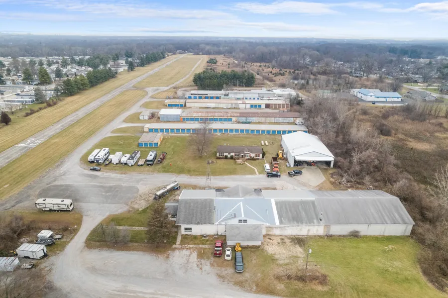 Welcome to Hobart Sky Ranch Business Complex, 4 parcels convey showcasing nearly 2.85 acres of operable space highlighted by the multiple large commercial grade buildings that are at your disposal to accommodate all your business needs. 88x60 post frame building with 14' tall ceilings lends half its space to insulated walls/ceilings and concrete floor with 50' W x 13'6" H electric folding door. Immediately to your south of parking lot lies over 14,500 sq ft of additional building space with yet another 50' w x 11' h bi-fold aviation/hangar door. Potential for various intended uses from recreation to business, and is even being used as owners current primary residence. Currently multiple cold storage areas under roof for RV, boat, camper, etc. dry rental storage spaces with large roll-up and sliding doors for easy ingress and egress. 35 individual indoor U Lock mini storage units under roof waiting for their next lease, as well as an auxiliary 10 unit exterior U Lock building. Expansive asphalt paved and manicured grass areas provide even more passive income potential for exterior cold storage for larger RVs, trailers, and heavy equipment. Multiple office and conference room space as well as studio apartment accommodations. A 3 bed 2.5 bath 1680 sq ft manufactured home currently being used as a single family residence, could easily become the HQ of your empire or additional rental income. B-2/3 zoning allows for the entrepreneurial imagination to run wild. Right in the cradle of the I- 65,80,90,94 corridors a breeze of a commute. A stones throw to Gary/Chicago International and a quick flight to Midway or O'Hare while offering the safe haven of privacy and advantageous Indiana zoning and tax law. Property is TAX EXEMPTIf interested in a full scale operation airport with +/- 25 acres see MLS ID 814338. 19 acres zoned industrial see MLS ID 825412 AGENTS PLEASE REFERENCE PRIVATE REMARKS AND ATTACHED DOCS!
