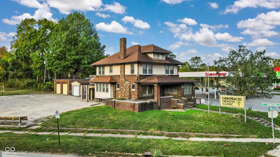 This freestanding commercial 3,294 SF building with residential charm is full of historic character and endless potential. For over 35 years, it was home to a successful chiropractic practice operated by one dedicated owner. Zoned C3, it offers flexibility for a variety of business uses. The 1,230 SF main floor includes a convenient half bathroom for clients, while the 1,044 SF upstairs apartment provides the opportunity to create a full bathroom, kitchen, and up to three offices or bedrooms-ideal for a live/work setup (with variance), additional office space, or income-producing unit. The 1,020 SF basement previously operated as a successful workshop for many years. Featuring a beautiful stone and brick exterior, welcoming front lawn, chimney, and patio area, the property offers strong bones, high visibility, and a proven location in one of Indianapolis's most vibrant historic districts. A large parking lot and additional rear lot provide room for expansion or storage. Bring your vision and restore this property to its full potential in thriving Irvington!