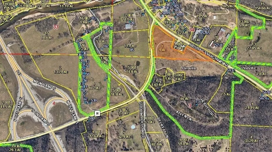 9 acres , m/l both sides and behind Dollar General in Pineville, Mo Just 1/2 mile from I 49, exit 5. Frontage on Business 71 and hwy H. Elec., water and sewer available. Room for more than 1 business on this highly accessible acreage. Just a 30 minute drive to Bentonville Arkansas, or Joplin Mo. Pineville is a great tourist area with Big and little Sugar Creeks and Elk River, and Sugar Creek State Park and State Forest all just minutes away.