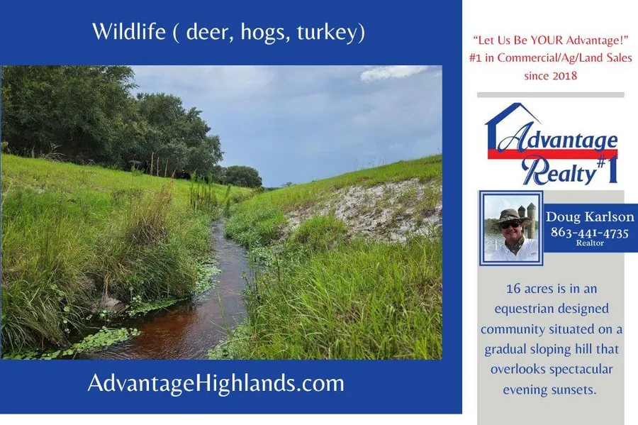 The 16 acres is in an equestrian designed community situated on a gradual sloping hill that overlooks spectacular evening sunsets.
