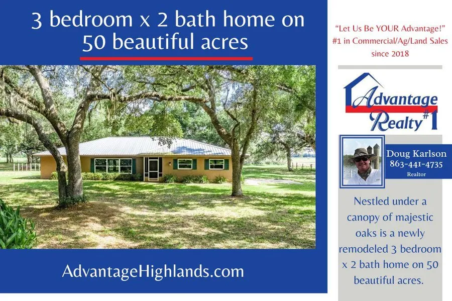 Nestled under a canopy of majestic oaks is a newly remodeled 3 bedroom x 2 bath home on 50 beautiful acres. A walking path from the back porch wanders under the oak Hammock to a covered barbecue picnic area for