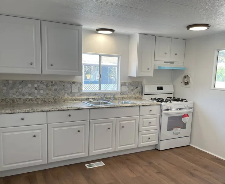 Move-in ready and fully renovated, this charming two-bedroom, one-bathroom manufactured home offers modern comfort and style. The newly updated kitchen boasts fresh finishes and a new range oven, perfect for preparing meals and entertaining. Enjoy consistent year-round comfort with a newly installed air conditioning unit. This home is not only aesthetically pleasing but also practical, featuring a convenient two-car covered carport and a spacious outdoor shed for all your storage needs. Experience affordable homeownership with the benefits of a low-maintenance lifestyle in a thoughtfully upgraded home. Located in the desirable community of Santa Rosa, you'll find everything you need for comfortable living right here. Enjoy both affordability and a modern aesthetic without sacrificing convenience in this beautifully renovated home. Having two community pools, spas, and laundry rooms; a clubhouse, and a gym provides residents with diverse on-site amenities for recreation, convenience, and fitness. The dual pools and laundry facilities reduce crowding, while the clubhouse and gym serve as central hubs for socializing, hosting events, and exercising.