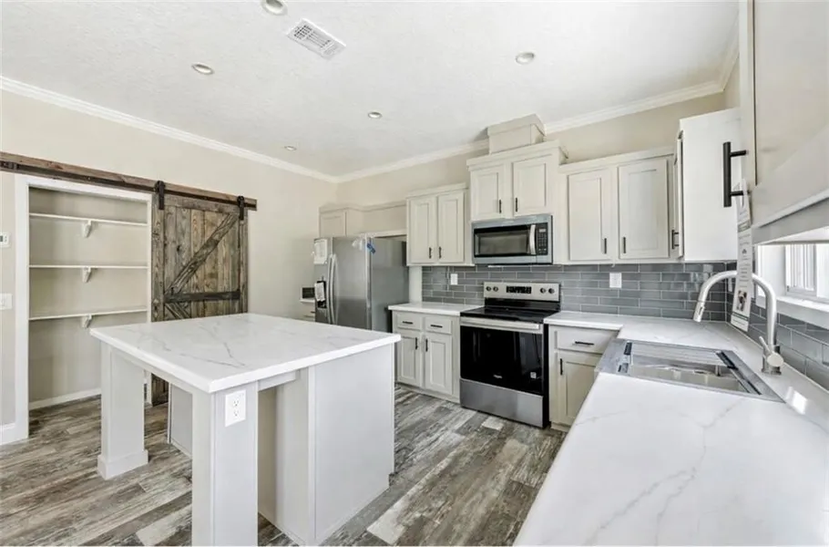 Step inside to an open floor plan featuring a spacious kitchen with a large island, walk-in pantry, abundant cabinetry, and stainless steel appliances—perfect for gathering and everyday living. The farmhouse-inspired finishes create a warm, inviting feel throughout.