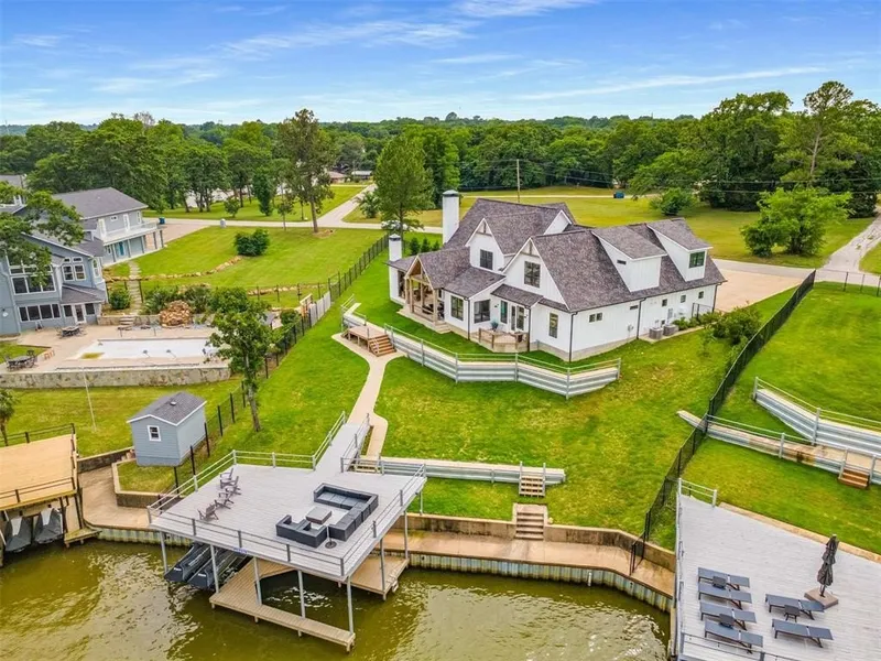 Just one hour from Dallas, 205 Oak Creek Drive isn’t just a lake house—it’s a destination. Perched above the shoreline in the heart of Cedar Creek Lake, this custom modern farmhouse delivers sweeping water views, refined indoor-outdoor living, and spacious design ideal for gathering friends and family year-round. Inside, the open-concept layout centers around a vaulted great room with warm wood beams, shiplap walls, and a stone fireplace. Expansive windows and French doors flood the space with natural light and stunning lake views. The designer kitchen boasts quartz countertops, a large island, and premium finishes—perfect for morning coffee, holiday spreads, or casual dinners for twelve. The flexible layout includes a main-floor study (or guest suite) with a full bath, plus a secluded primary suite with private patio access to enjoy sunrise on the water. Upstairs, two guest bedrooms with en-suite baths provide comfort and privacy, while the massive rec wing includes a bunk nook, full bath, game room, and private bedroom—ideal for kids, teens, or extended guests. Outside, a wraparound covered porch with porch swings, an outdoor fireplace, and built-in grill offers the ultimate entertaining space—perfect for hosting Thanksgiving by the fire or watching football with a lake breeze. The fenced yard leads to a private boathouse with a 25-ft boat slip, two jet ski lifts, and a party deck with open water views. Located in the friendly Arnold Hills community, 205 Oak Creek is perfect as a full-time home, holiday hub, or weekend retreat—just a short drive from the city, but a world away in experience.