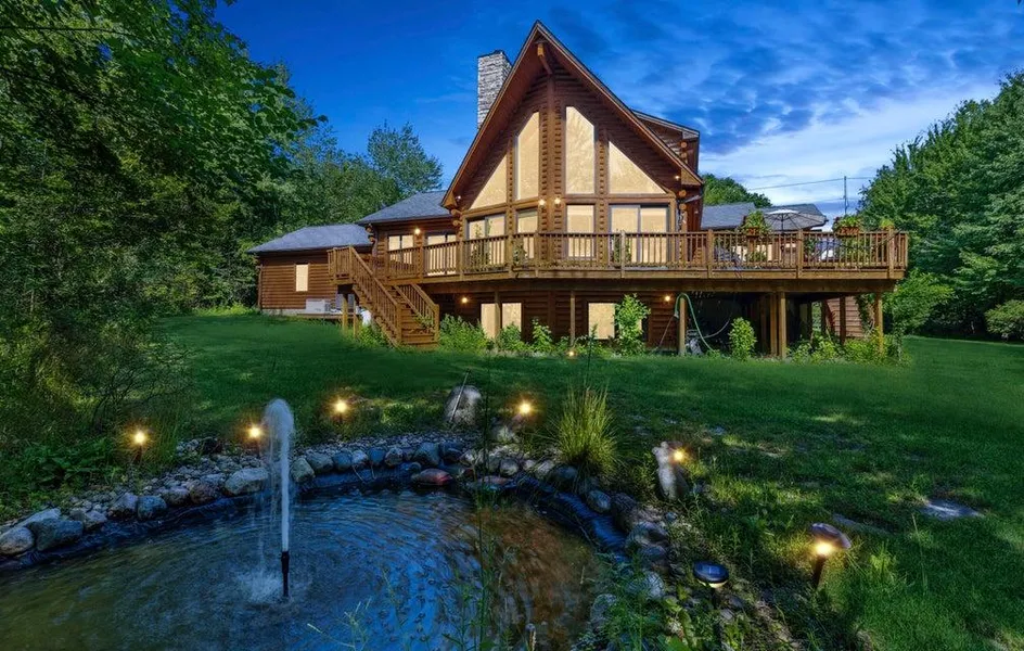 Less than 2 hours from Chicago, nestled on 10 acres, this modern log home is surrounded by fruit and flower gardens, and is minutes from Lake Michigan and Paw Paw Lake. The terrace spans the entire home, offering an idyllic space to enjoy sunrises, sunsets, and summer entertaining. Upon entering, the great room opens to a vaulted ceiling, showcasing nature as your backdrop. An upstairs primary suite, with separate sitting area overlooks the great room, deck & gardens. A 2nd primary suite is located on the main floor. Off the foyer, a cozy sitting room, ideal for tea or enjoying the beautiful view. The walkout level includes 3 additional bedrooms one of which is currently shown as an office), and a game room, ideal for family or guests.