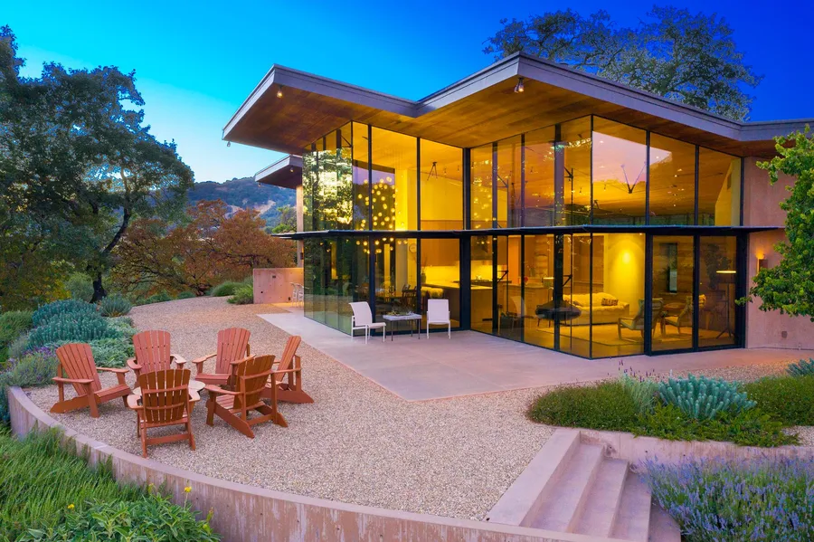 Embracing the contours of the land, earth and modern architecture converge to create the centerpiece, an architecturally significant modern main residence. Formerly featured in Dwell Magazine, with rammed earth and glass walls influencing the design throughout. Thoughtfully positioned on the land, the 3-bedroom, 3-bath dwelling features multiple sliding glass walls which allow for indoor/outdoor living. At the main entrance, guests are greeted by the sound of cascading water from the surrounding water feature as you they enter the oversized pivoting glass entry door. The open floorplan takes advantage of the expansive views through the impressive floor-to-ceiling glass walls. The kitchen is well-appointed, with Miele and Viking appliances. The master suite opens to a private in-ground spa, which also benefits from the calming flow of water from the nearby water feature. Most impressive, is the shower in the master bath, with an oversized glass sliding door, transforming the posh shower into an outdoor shower experience. Warmth comes from within, via radiant heat flooring in every room. The outdoor space is landscaped to compliment, with sitting and outdoor dining areas positioned to embrace the morning sun and protect from the afternoon weather elements. Tiered beds of lavender frame the staircase below to the solar heated salt swimming pool at a slight elevation, taking full advantage of the picturesque views. The contemporary design lends itself to the natural landscape, creating a perfect balance.