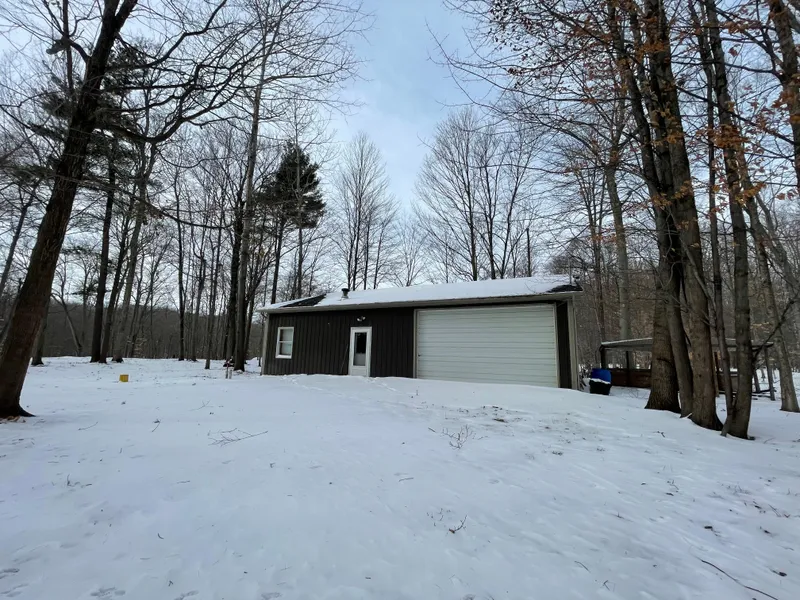 This property features a 30x40 pole barn cabin with living quarters inside. Including 3 bedrooms, kitchen, great room, bathroom, electric, well, and septic. The cabin is perched on a ridge overlooking Fish Creek, which is a trout fishing gold mine.