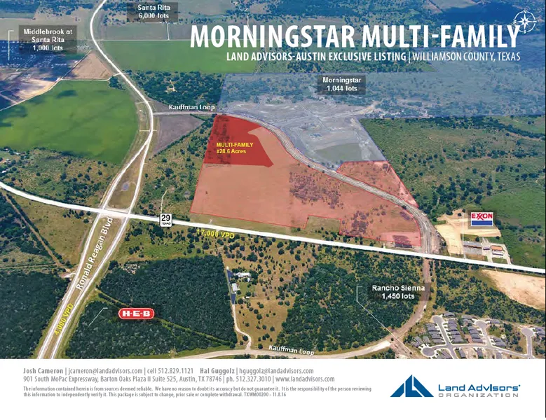 COMMENTS The Austin MSA has experienced exponential growth over the past few decades. The Ronald Reagan & State Highway 29 corridor has been at the epicenter of this tremendous growth. Currently, There are 22,125 future lots in new home residential subdivisions planned in this corridor. Many of these new residents are commuting to employment centers located just south in and around the Cedar Park & Round Rock areas. Within a one mile radius of Morningstar Commercial there are over 12,000 new homes planned and under development with over 30,000 projected residents.