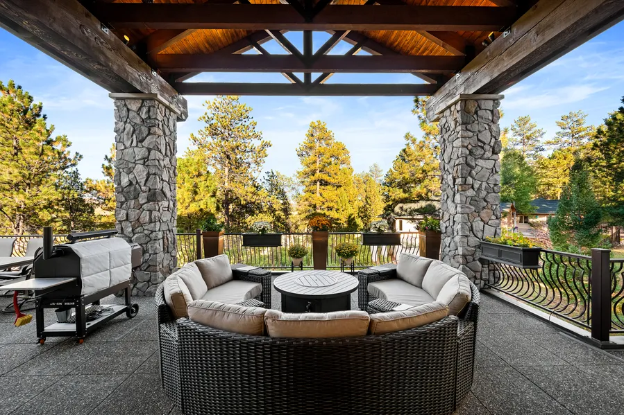 Tucked within the serene landscape of Perry Park, this exceptional custom ranch offers unparalleled Colorado mountain living. Spanning two separate parcels totaling just over two acres—the main lot (.95 acres) and a secondary parcel (1.14 acres)—this remarkable estate offers the perfect blend of privacy, security, and opportunity for future expansion. Thoughtfully designed, the home offers four oversized, heated garage bays, plus a distinguished porte-cochère. Inside, the grand main living area welcomes you with soaring ceilings accented by rich wooden beams, creating a warm yet sophisticated atmosphere. The bright, open-concept layout flows seamlessly between the chef’s kitchen and main living space. Expansive Pella windows frame views of towering Ponderosa pines, while over 2,000 sqft of deck and patio space allow for effortless indoor-outdoor living. The kitchen is a chef’s dream, equipped with premium Wolf, Dacor, and Sub-Zero appliances, a new Monogram Café Door double oven, oversized island, and exquisite slab granite countertops. The main floor primary suite is a private retreat, featuring a spa-inspired bath with a Jacuzzi tub, two-way fireplace, abundant natural light, and tranquil forest views. Downstairs, you’ll find two additional guest suites along with a full kitchen and a stylish bar and entertainment area. This level opens to a bright walkout patio through a sliding glass door custom-fitted with Hunter Douglas Duette Honeycomb blinds, extending the living space and maximizing outdoor living. Entertainment is elevated throughout with a dedicated Dolby Atmos 7.1.4 home theater, designed with custom acoustics, three AC power circuits, and Apple TV integration. For wine enthusiasts, a 775-bottle climate-controlled cellar completes this lower level. Perfectly positioned just one mile from Perry Park Country Club’s championship golf course and only minutes from I-25, this secluded retreat offers serenity without sacrificing accessibility.