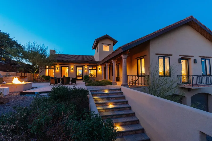 The two-story Spanish style adobe villa boasts 5,200+ square feet of luxurious living space in a serene and private setting. Substantially renovated in 2014-2015, the three bedroom, three and a half bath home features a dramatic great room with wood burning fireplace and gaming lounge, chef's kitchen, expansive dining area, private master suite with living area or office and two guest suites on t...