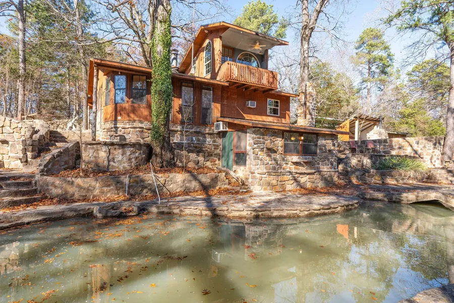 The rooms consist of a combination of several rooms to include cozy living areas with woodburning stoves, European style sleeping nooks, two kitchen areas, two bathrooms, and a walkout basement/cellar that leads out to the expansive rock work surrounding the home and the creek. There is a stone bridge that crosses the creek to access a cozy outdoor fireplace and sitting area. Multi-level rockwork surrounds the entire home and creek with lots of sitting areas. There is even an outdoor shower, as well as raised natural stone garden beds for the garden enthusiast.