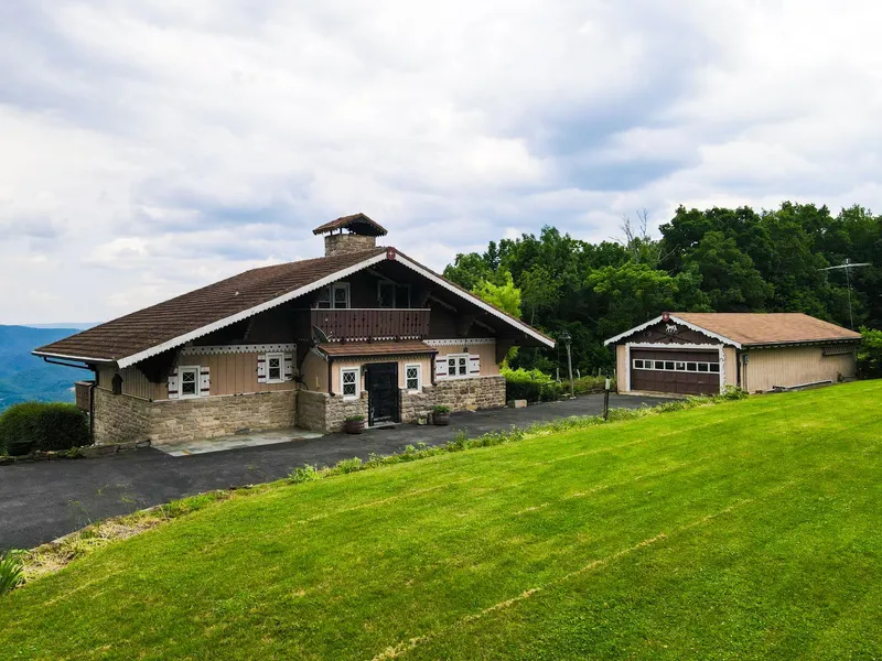 Switzerland atop Greenbrier Mountain. A private estate accented with exquisite craftsmanship, breathtaking views of The Greenbrier and White Sulphur Springs. 45+ acres. The Swiss Chalet, with spectacular architectural design, features 4-5 bedrooms, 2.5 baths, double balconies, 37 ft X 12 ft X 5 ft thick limestone chimney, 19 ft cathedral ceilings, wormy chestnut walls with oak and chestnut beams. The interior is an open floor plan, 3 levels of living space including a loft with private balcony, and outdoor entrances from every room. Enjoy the outdoors with a stone floored arbour, fire circle patio, garden areas, riding corral, goat pen, pastures and woodland. 21X50 Garage. Land: additional view building sites, joins the Greenbrier Sporting Club. Good road access. Private Entrance.