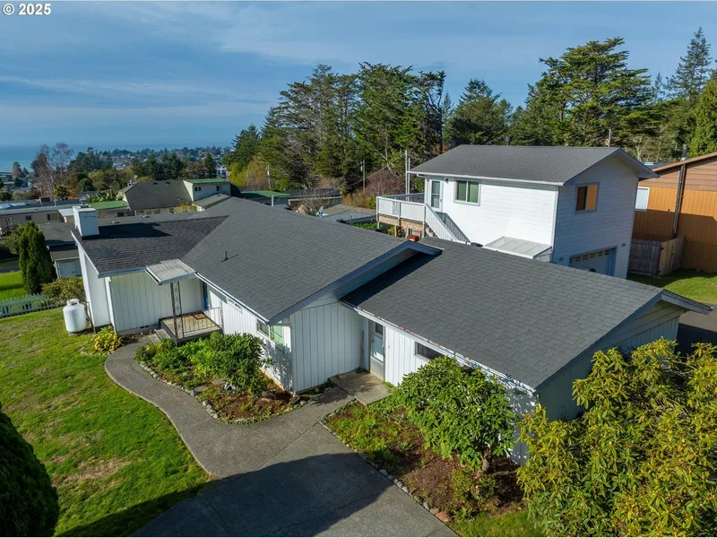 Rare Brookings opportunity offering two well-maintained dwellings on one property in a quiet, desirable neighborhood close to town. The primary residence is a single-level 2 bedroom, 1.5 bath home with an attached single-car garage, currently operating successfully as an Airbnb. Thoughtfully maintained, this home features washer/dryer hookups, a propane fireplace, and an efficient, comfortable layout ideal for full-time living or continued short-term rental use. Adjacent to the main home is a 1 bedroom, 1 bath apartment located above a 2-car garage, offering excellent separation and privacy. Enjoy a peek-a-boo ocean view, especially from the apartment's deck. The apartment includes washer/dryer hookups located in the garage, a propane fireplace, and a kitchenette with sink, counters, and cabinetry (no range), making it ideal for guests, extended family, or supplemental rental income. Bot...