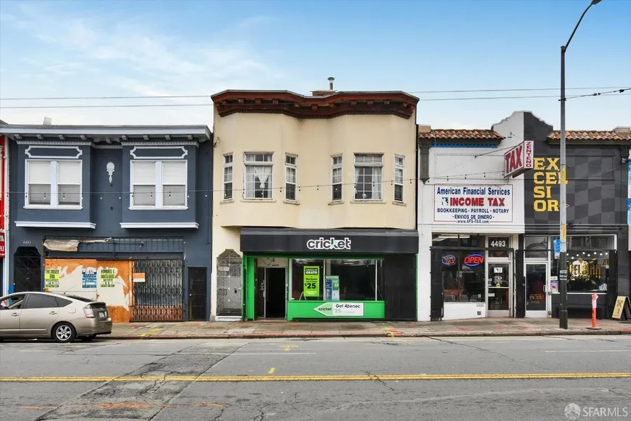 Dual-income potential: Perfect for owner-occupancy with supplemental rental income, or a pure investment opportunity. Excelsior District: Mixed Use with heavy foot traffic. Vacant upper flat is 2 bedrooms and 1 bath residential unit with spacious attic. Street level is commercial renting month to month $2,650. Back 2nd unit is 1 bedroom and 1 bath (tenants occupied $940 per month). If you have any questions please feel free to call Tel: