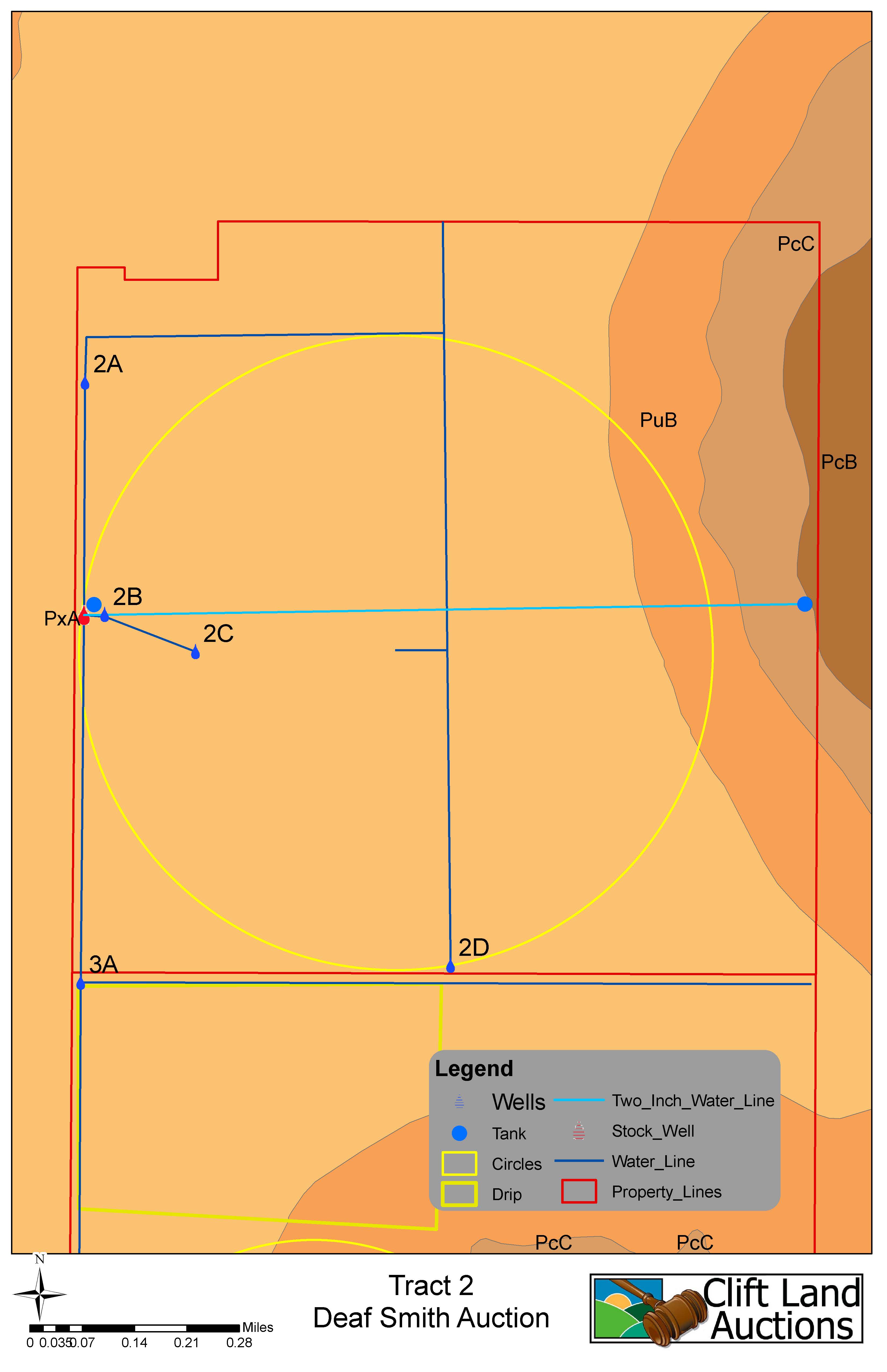 Irrigation water is provided by four submersible wells. Water is disbursed through one 2014 Reinke sprinkler covering 170+/- acres and a 105+/- acre drip irrigation field on 30 tape centers for a total of 275+/- irrigated acres (43% developed). The sprinkler is nozzled for 500 gpm. A water line currently crosses County Road 23 to connect Tracts 2 and 3. The High Plains Underground Water Conservation District flow tested the wells on 9-17-2024 with a result of 258+/- total gpm. Three phase electricity is currently used and accessible to the farm. There is a livestock well and tank near the center of the tract.