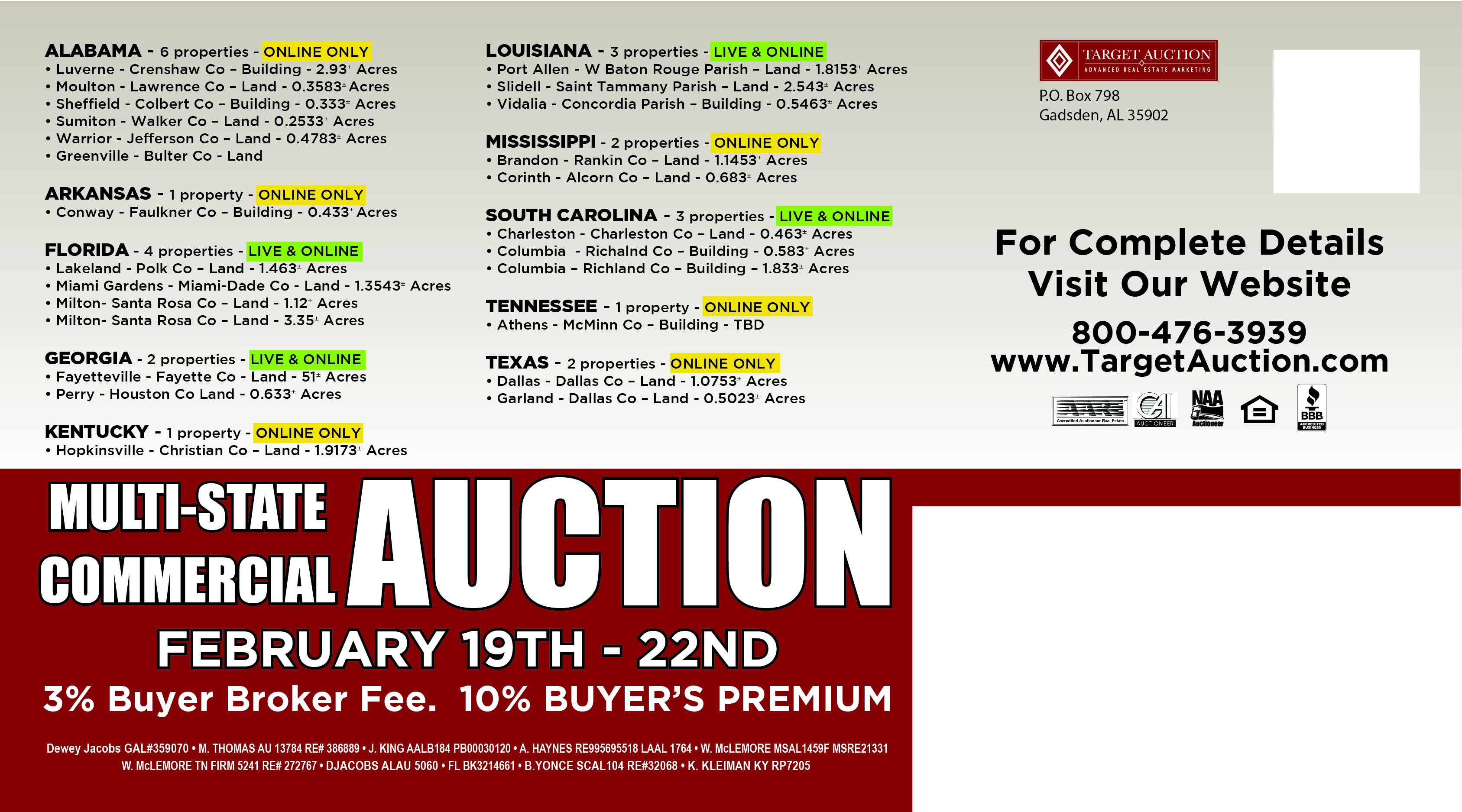Auction Dates: Monday, February 19th thru Thursday, February 22nd. See each propertys auction page to confirm the date and time of the auction.