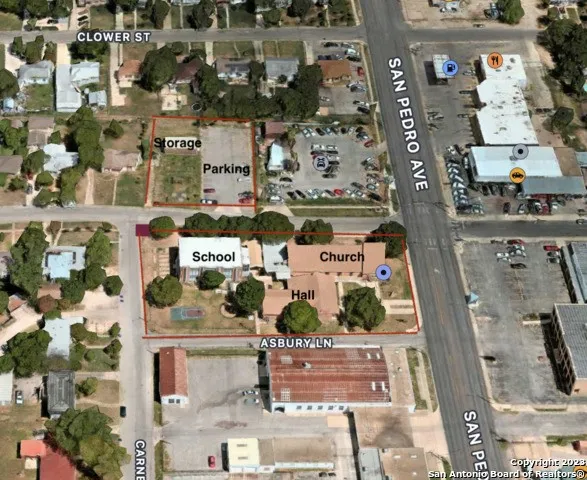 This is a complete church/school/hall campus located just north of downtown San Antonio with ample parking. The Sanctuary (5,034 SF), Fellowship Hall (3,405 SF) and Education Building (6,047 SF) have had some recent updates including foundation repairs, gutters installed and roof repairs completed. The Sanctuary has new carpet in the altar area and the entire campus has been updated with LED lighting. Some HVAC replacement and repairs were done and they recently installed new flooring in the Fellowship Hall and had updated the kitchen. The entire campus has had cyclone fencing installed around the perimeter. There is an addition storage building. All this on 1.2643 acres covering an entire city block and adding lots for parking. Unique church financing available.