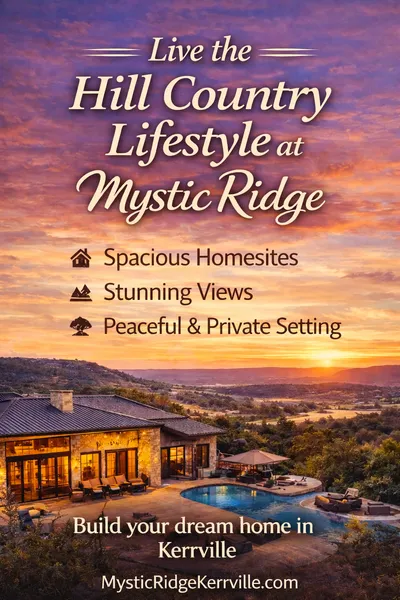 Perched high above the rolling countryside, this exceptional homesite at Mystic Ridge Estates offers breathtaking 360-degree panoramic views across the heart of the Texas Hill Country. From sunrise spilling over distant ridgelines to unforgettable sunset skies stretching for miles, this property delivers the kind of elevation and scenery that simply cannot be duplicated. Spanning 20+ acres of pristine Hill Country terrain, the land features a blend of gently rolling topography, mature native trees, and open build sites perfectly positioned to capture expansive long-range views in every direction. Whether you envision a modern hilltop estate, a ranch-inspired retreat, or a private family compound, this tract provides the ideal canvas. Located just minutes from downtown Kerrville, you'll enjoy the rare balance of peaceful seclusion and convenient access to dining, shopping, medical facilit...