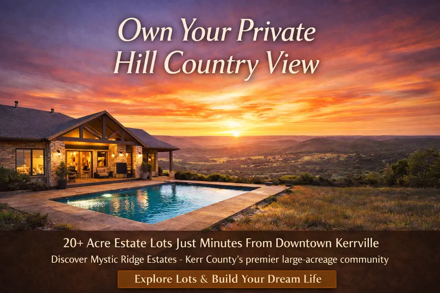 Perched high above the rolling countryside, this exceptional homesite at Mystic Ridge Estates offers breathtaking 360-degree panoramic views across the heart of the Texas Hill Country. From sunrise spilling over distant ridgelines to unforgettable sunset skies stretching for miles, this property delivers the kind of elevation and scenery that simply cannot be duplicated. Spanning 20+ acres of pristine Hill Country terrain, the land features a blend of gently rolling topography, mature native trees, and open build sites perfectly positioned to capture expansive long-range views in every direction. Whether you envision a modern hilltop estate, a ranch-inspired retreat, or a private family compound, this tract provides the ideal canvas. Located just minutes from downtown Kerrville, youll enjoy the rare balance of peaceful seclusion and convenient access to dining, shopping, medical facilit...