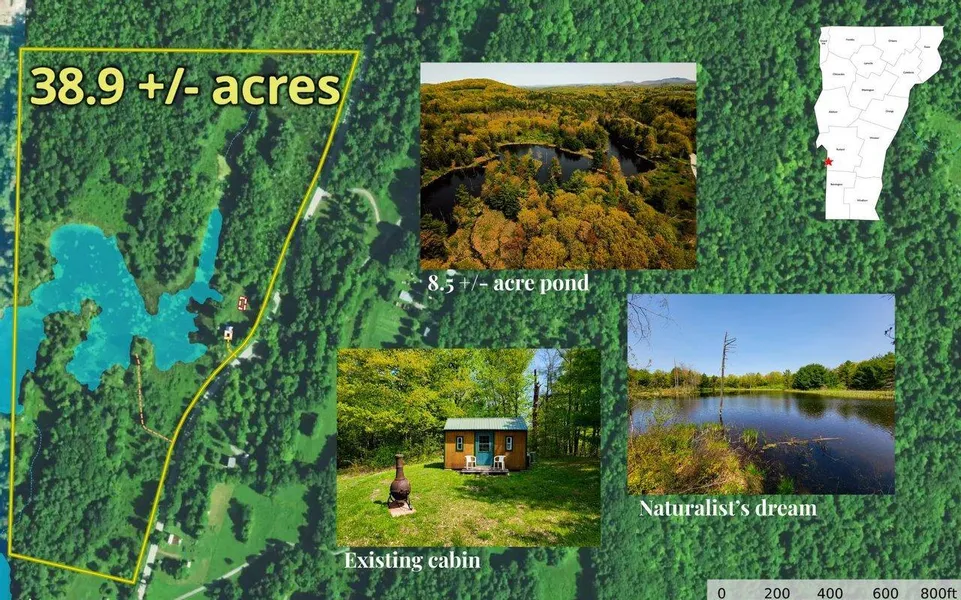 Come explore and experience tranquility at your own "Walden Pond" on this 38.9 +/- acre property complete with an 8.5-acre pond, hardwood forest and quaint little camp in the charming Vermont town of Wells! The property is a Naturalist's dream with wood duck boxes in the pond, turtles sunning themselves and white tail deer on the banks. Existing structures feature an enclosed, but unfinished, 2 car garage with a concrete foundation, a small bunkhouse/cabin, a privy and a wonderful patio overlooking the pond. Be ready to upgrade because this property comes with a state- issued permit for a 2-bedroom residential septic system and drilled well. Power and phone are located at the street. There is an old stone foundation that would be perfect for summer flowers or an herb garden. Apple trees abound with many birdhouses set throughout the property. A mowed path takes you out to a peninsula on ...