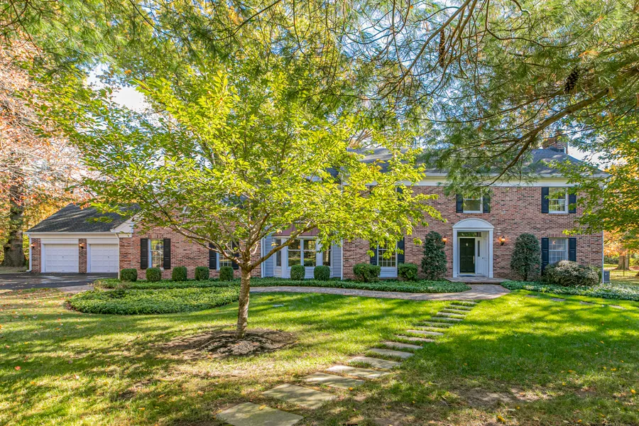 From the solid-brick construction to the impressive address, this gated home is intriguing from the start. One look at the private, nearly four-acre yard, where nature’s beauty is on full display, and you’re sure to be smitten! Inside, sunny space abounds, especially with a converted great room lined with big windows and topped with a skylit cathedral ceiling. A loft and loads of built-in storage let this valuable wing serve myriad needs. The home’s more traditional rooms include a front-to-back living room and an open dining room, both with fireplaces and hardwood floors. The central kitchen, equipped with a new fridge, Bosch dishwasher and double ovens, adjoins the breakfast room, where wide sliders open to a sprawling paver patio surrounding a pool and integrated spa. An office quietly situated beside the marble-floored powder room makes the main level complete. Atop the stairs, an updated hall bathroom serves two corner bedrooms. Two more bedrooms have baths en suite and stunning views of the grounds, including the airy, multi-room primary with endless potential. Laundry is located both upstairs and in the basement, a perk that will be appreciated when entertaining poolside. A pretty breezeway connecting the garage is another well considered touch that demonstrates the comfortable livability of this utterly refined home.