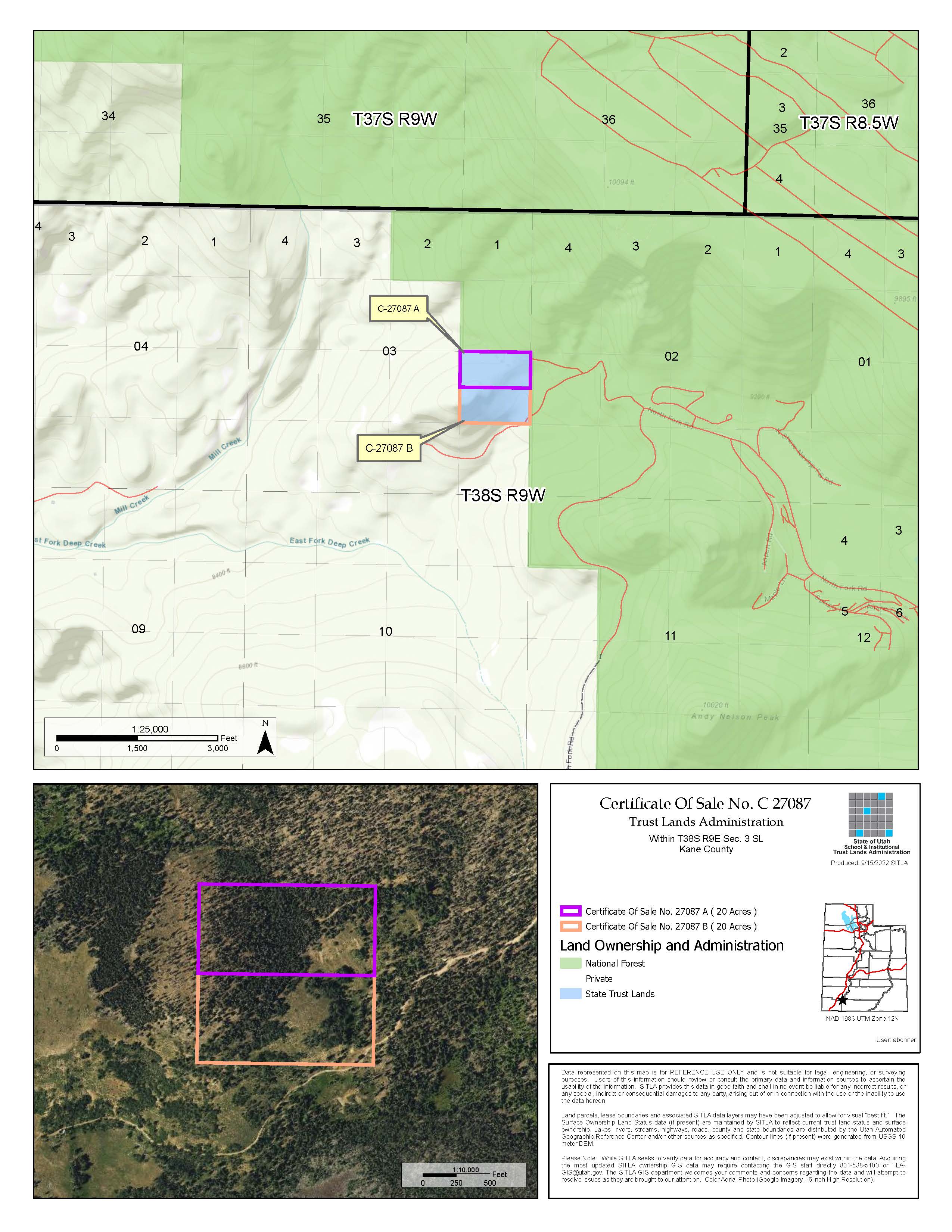 LAND FOR SALE AT A PUBLIC AUCTION: Utah School and Institutional Trust Lands Administration is selling 2 adjoining, 20 acre properties, near Navajo Lake in Kane County, Utah. These beautiful properties are bordering Forest Service property and have good access, along North Fork Road. The terrain is gentle sloping with many flat areas and clearings suitable for development. The vegetation consists of aspen stands, various species of pine trees, and native brush and grasses. A 40-foot access easement will be reserved along the eastern boundary of the southern parcel to provide access to the northern parcel. The auction will be held online November 9-15, 2022. Financing is available.