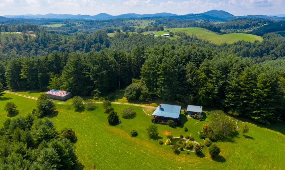 NC MOUNTAIN SOUTHLAND LOG CABIN WITH TROUT STREAM AND ACREAGE! Your dream of owning a farm, winery or family compound on a bold creek can come true on this amazing 70-acre property in Sparta, NC. The 2-bedroom, 1-bath Southland Log Cabin sits in a parklike setting on this lush & completely private property, which also offers a mile of frontage on Brush Creek, stocked with trout and featuring several flat beaches for picnics, swimming, fishing, & tubing. The view from the homes spectacular wrap-around porch centers on an ornamental pond surrounded by lovely landscaping, fruit trees woodlands & mountains beyond. The property primarily consists of rolling pastures perfect for animals grazing or planting the crop of your choice. In addition to the covered porch, the cabin offers an open floor plan & cathedral ceiling, a rock wall w/ a fireplace, an antique marble sink and vanity in the bathroom, plus a spacious laundry room. The large open kitchen features 100-year-old reclaimed pine floors & countertops & lots of natural light. With several additional building sites on or off the creek, the property currently features 2 outbuildings: a hay barn and a large workshop with a pot-belly stove, walk-out double doors, & a carport. The location is within a two hour drive of Charlotte and Greensboro. Call today for additional information on our listing R199.