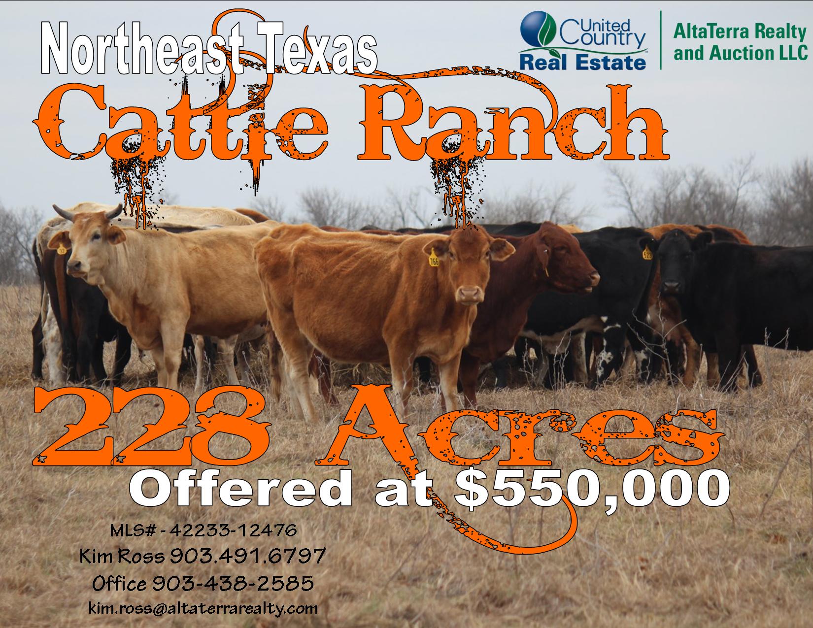 Northeast Texas Cattle Ranch for sale!!!!! 228 Acres of good open grass and plenty of water highlight the top of the amenities of this ranch. Located near Paris Texas, this ranch is currently being utilized as an intense rotational grazing cow/calf operation. Multiple pastures fenced and cross-fenced allow for any type of rotational balance wanted.