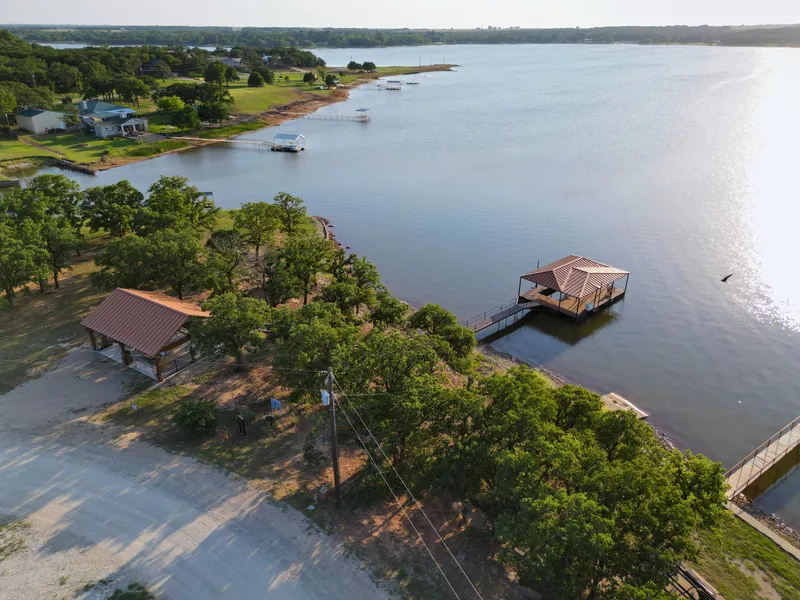 Half an acre on Lake Nocona! Includes newly built pavilion with built-in grill and additional private-parking area. Pavilion is located on the elevated portion of the property. The land slopes beautifully towards the lake and retaining wall. The sunset views never get old here. And they are all-year long. A truly perfect place for any family, friends, or entertainment gathering. A great space for some extra peace and quiet is also very much enjoyed here. Property has beautiful landscape and design including mix of rock, stone, and granite. New Boat Dock is the icing on the cake. Property is ready with water, electric, and propane.