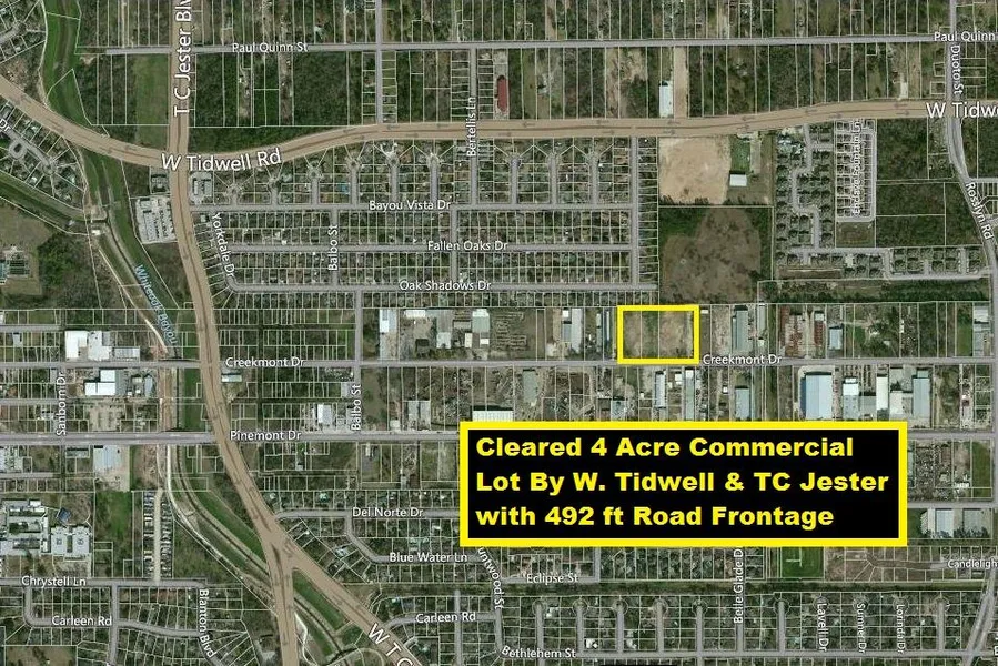New Price! 4.0 Acre Commercial Lot w/484 ft Rd Frontage in NW Houston by W. Tidwell & TC Jester. City Utilities! Property has Nice Shade Trees Along Perimeter and is Cleared & Fenced w/2 Large HEAVY Gates. Use East End Gate by metal buildings & close gate behind you! Close to Hwy 290, I-45 & 610 Loop. 12 Miles to Downtown Houston/Convention Center, Minute Maid Park, Greyhound Bus Terminal & 3 Major Universities. 20 Miles to Bush Intercontinental Airport & Port of Houston. Great location for Multifamily, Investment, Buy & Hold, Mixed Use or Commercial Use. Perfect for Townhouses, Apartments, Office/Warehouses, Hospital/Urgent Care, Food Truck Stop, Storage Center, Boat/Truck/RV Storage, Gas Station/Convenience Store, Recreation Center/Natatorium, Church, Private School, Auto Sales Lot/Maintenance Shop, Grocery Store, Retail/Service Center, Sports Complex, Ice House/Sports Bar, Hotel/Motel...