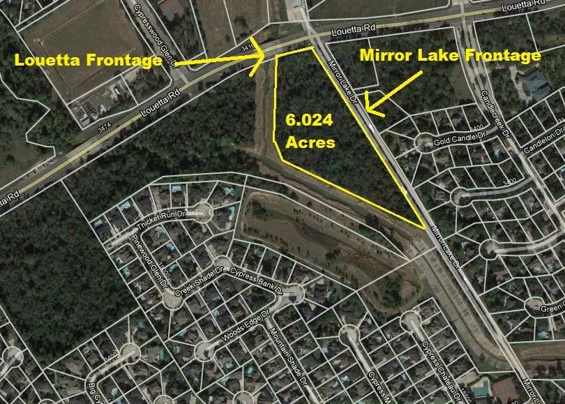 New Price! Great Price For Great Location! Great Investment for this Corner Lot with ~200 ft of Louetta Rd frontage & ~1000 ft of Mirror Lake Dr frontage. Seals Gully runs along west border. Close to I-45 provides quick commute to downtown Houston. Surrounded by residential properties makes this prime location for a Church, Multifamily, Business or Commercial Development. This parcel is 6.024 acres. 4.005-acre parcel is also for sale separately under listing #1165457 or together under listing #1187330. Must check this area out, its growing with Commercial Development. Call today!! New Survey in Docs!