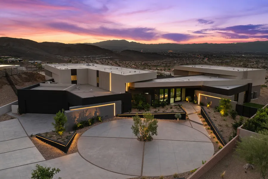 Priva — a Blue Heron Elite Custom Luminary Home completed October 2025 — is located at 716 Dragon Peak Drive in the gated community of MacDonald Highlands. Built on the last available homesite along a cul-de-sac of architecturally significant residences, this two-level home by renowned firm Blue Heron spans approximately 8,832 sq ft on a 0.91-acre lot. The residence offers 5 bedrooms, 5.5 baths, and a 6-car garage with gated driveway. The first level features floor-to-ceiling glass pocket doors framing Strip, valley, and mountain views, a top-of-the-line kitchen, prep kitchen, great room, wine room, and formal dining. Additional spaces include a media room with wet bar, gym, and office. Two staircases lead to the upper level, where the primary and secondary suites each offer panoramic views and spa-inspired baths. Outdoor amenities include a pool, spa, 12-foot fire feature, and areas for dining and entertaining.