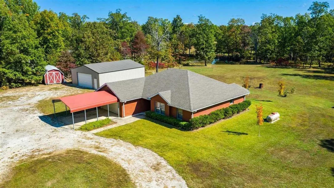This approximate 1505 Sq. Ft. house built in 2004 has mixed use residential, timberland sitting on approximately 10 acre property and has a large Blown in Insulated Shop with 2 roll up doors, highway 175 frontage tucked back behind trees for privacy. This brick home has 3 bedrooms, 2 bathrooms, house was built to accommodate wheel chairs and walkers. Open floorpan has kitchen overlooking dining area or you could call it a breakfast nook and a door leading out to a covered, concrete back porch just perfect for grilling or just sitting and watching the whitetail deer and turkey cross the back yard to go get a drink from the shared pond. There is nice mature timber on property as well. The kitchen also over looks the living room with a bar for extra seating. Master bedroom is large with a master bathroom and right outside of this door is another door leading out to the back porch as well. There are 2 other bedrooms with a bathroom. Both rooms are nice size. The shop has concrete flooring, 2 roll up doors on in front and one in back. It has blown in insulation. House has a 2 car garage attached and a detached 2 car carport. House is central heat and air with back up propane. There master bathroom has a true walk in shower with an additional tub/shower combo and double sinks with a large closet all in bathroom. The quest bathroom has a tub shower also. There are numerous trees in the back yard with one being a fig tree and they are delicious! This home has been very well kept and has architectural shingles! Built in 2004 and has a well for water and is on NAEC for electric. Located just 9.5 miles from the center of Hardy, AR 72542 in Sharp County with highway 175 road frontage. This is a must see! Listed with Mossy Oak Properties Strawberry River Land & Homes, 870-495-2123. Listing agent, Pamela Welch at 870-897-0700. Would love to show you this home!!