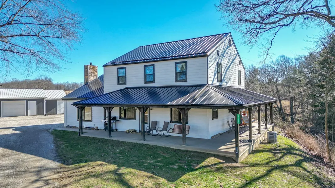 Welcome to a modern farmhouse located in Hocking County! The home sits on 3.206 acres and features 5 bedrooms and 2 bathrooms. The entire house was renovated in 2018 and a second story was added in 2020. It also comes with a new septic system, a private well, and a detached garage. The house has hickory hardwood flooring and milled pine trim from the property, giving it a rustic feel. The living room boasts a stone fireplace and wood-burning stove, perfect for chilly evenings. The kitchen has concrete countertops and a built-in oven and microwave. The wrap-around porch is a key feature and is built with milled lumber from the property. Outdoor entertaining is a breeze with the large, exposed aggregate patio. The first floor features an owner's suite and laundry area.