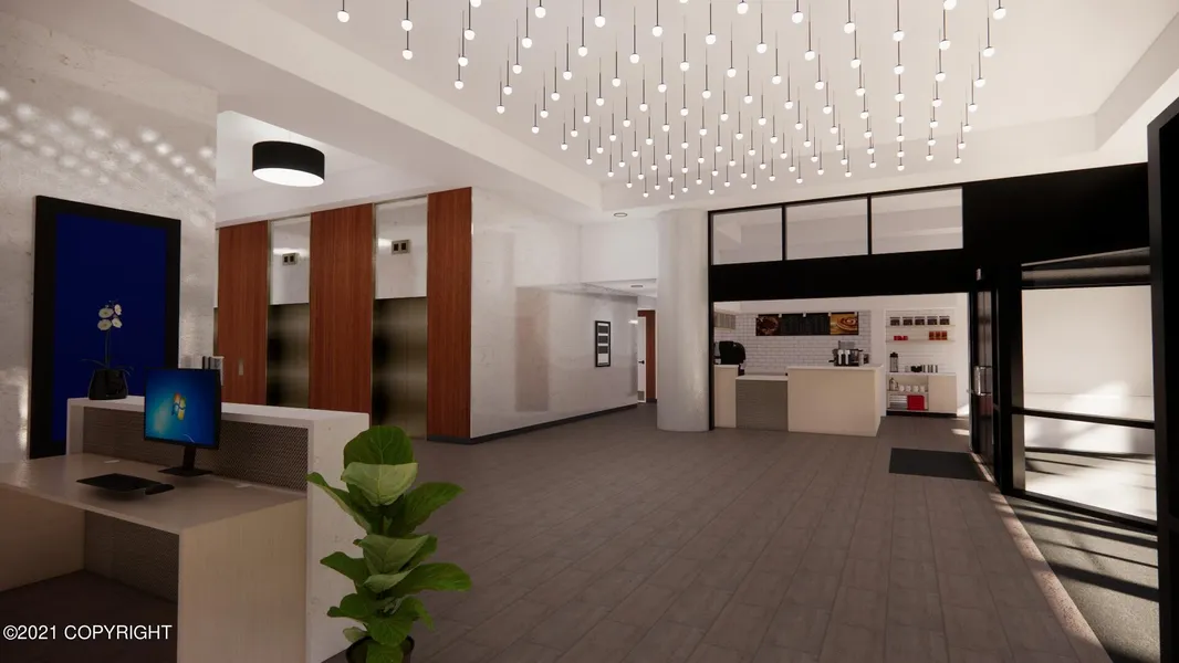 Take part in this exciting opportunity to open a café in the Frontier Building. The café is located in the building lobby on the first floor. The Frontier building is a class A office building located in Midtown Anchorage with a recently finished lobby remodel. View the flyer and design concepts for a snapshot of the atmosphere. Cost and size to be negotiated alongside finalizing the design. This building features on-site garage parking, 24-hour on-site security, conference rooms, a day porter, full service janitorial and on-site property management.