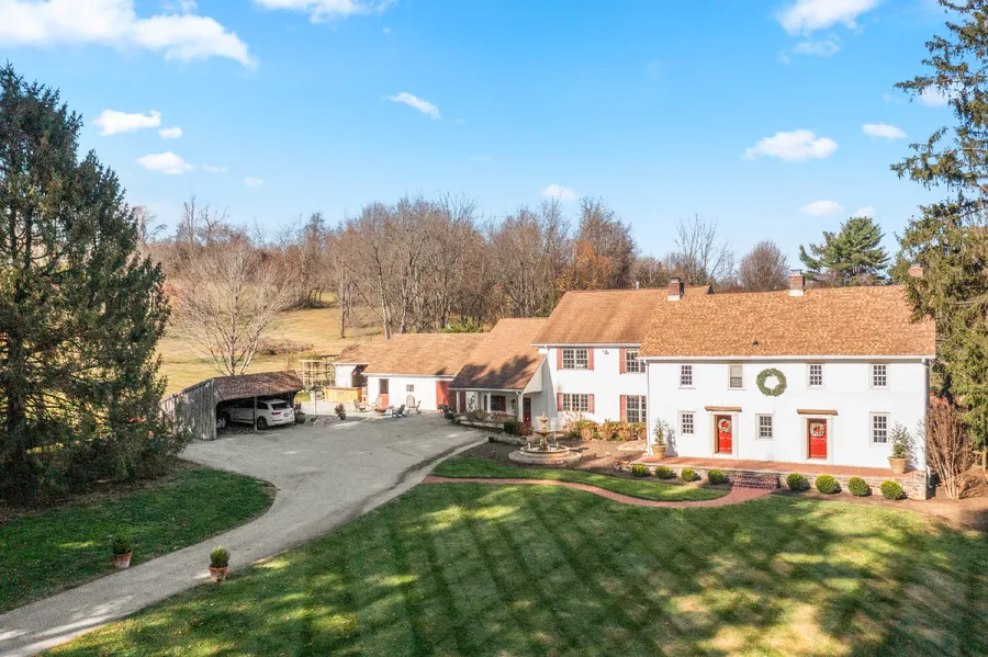 Experience timeless elegance with this stately Chester County farmhouse nestled on over 4.6 acres within the coveted Unionville-Chadds Ford School District. A gated entrance leads you to a classic 1746 stone farmhouse seamlessly enhanced by a 2009 addition, combining historic charm with modern luxury. The original stone farmhouse welcomes you with two distinct entrances: one opening into a living room adorned with deep marble windowsills and a cozy wood-burning fireplace, and the other into an inviting den featuring a brick-surround wood-burning fireplace and a convenient half bath. Adjacent to the den, discover a rustic pub boasting exposed stone walls, a fireplace, a bar, and direct access to a rear patio overlooking perennial tiered gardens, a tranquil fountain, and a sparkling pool—your private oasis. Upstairs, three spacious bedrooms offer scenic countryside views, complemented by a...